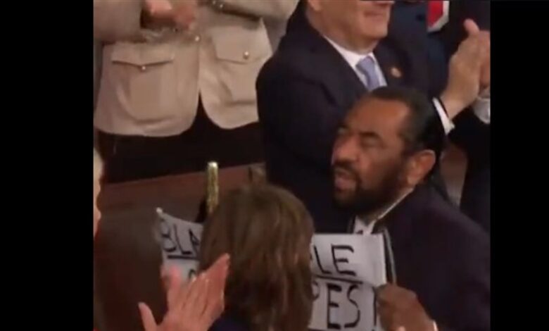 خلال إلقاء الرئيس الأميركي دونالد ترامب خطاب حالة الاتحاد أمام الكونغرس، رفع نائب ديمقراطي من أصل إفريقي لافتة كتب عليها “السود ليسوا قرودا” قبل أن يتم اقتياده خارج القاعة.